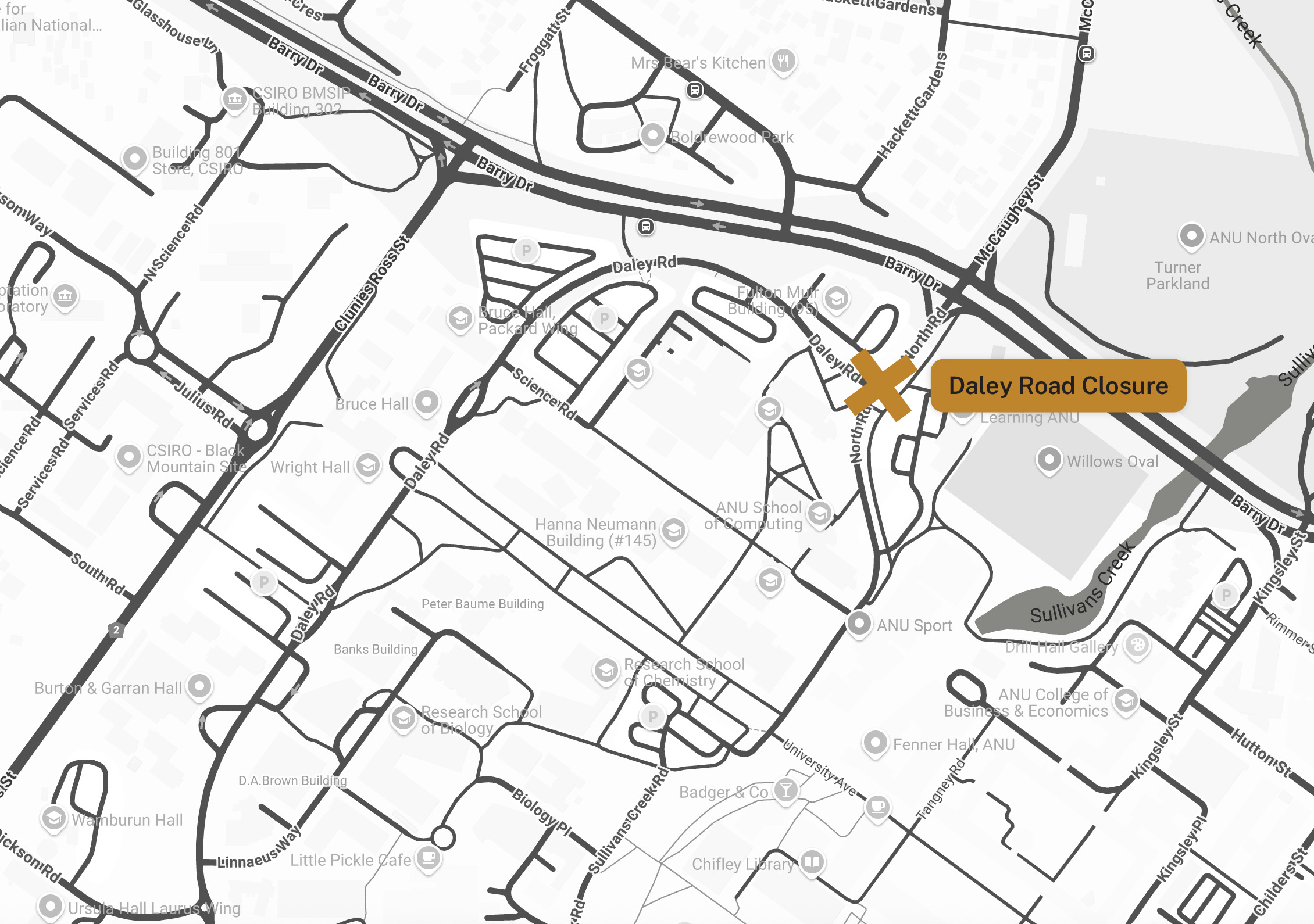Access to all ANU car parks and buildings will be maintained, however, there will be significant detours and temporary traffic management measures.